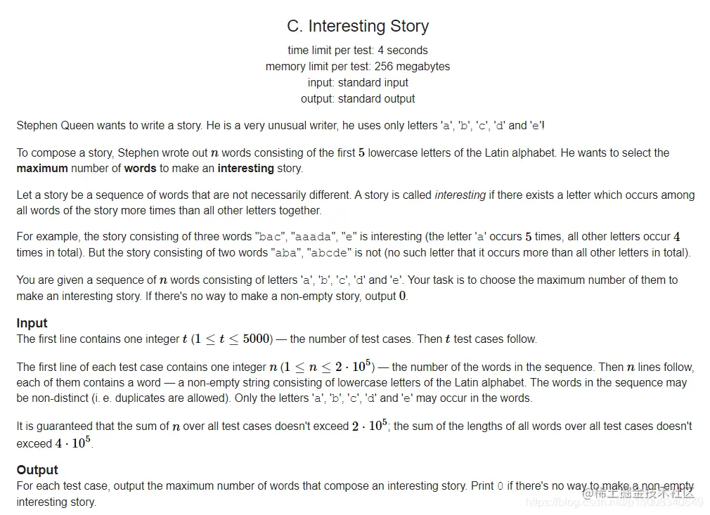 因为仅出现5种字母,因而我们可以考虑对5种字母进行枚举,考虑每一个字母在各自的串中的贡献,例如:串aaacee,在该串中,字母a的贡献为:3-3 = 0,c的贡献为1-5 = -4; 对这些贡献由大到小排序,再依次累加,当累加的贡献小于等于0时,就是该字母作为最大字符数时所能选择的最多的串; 然后取五次结果中的最大值即为答案。