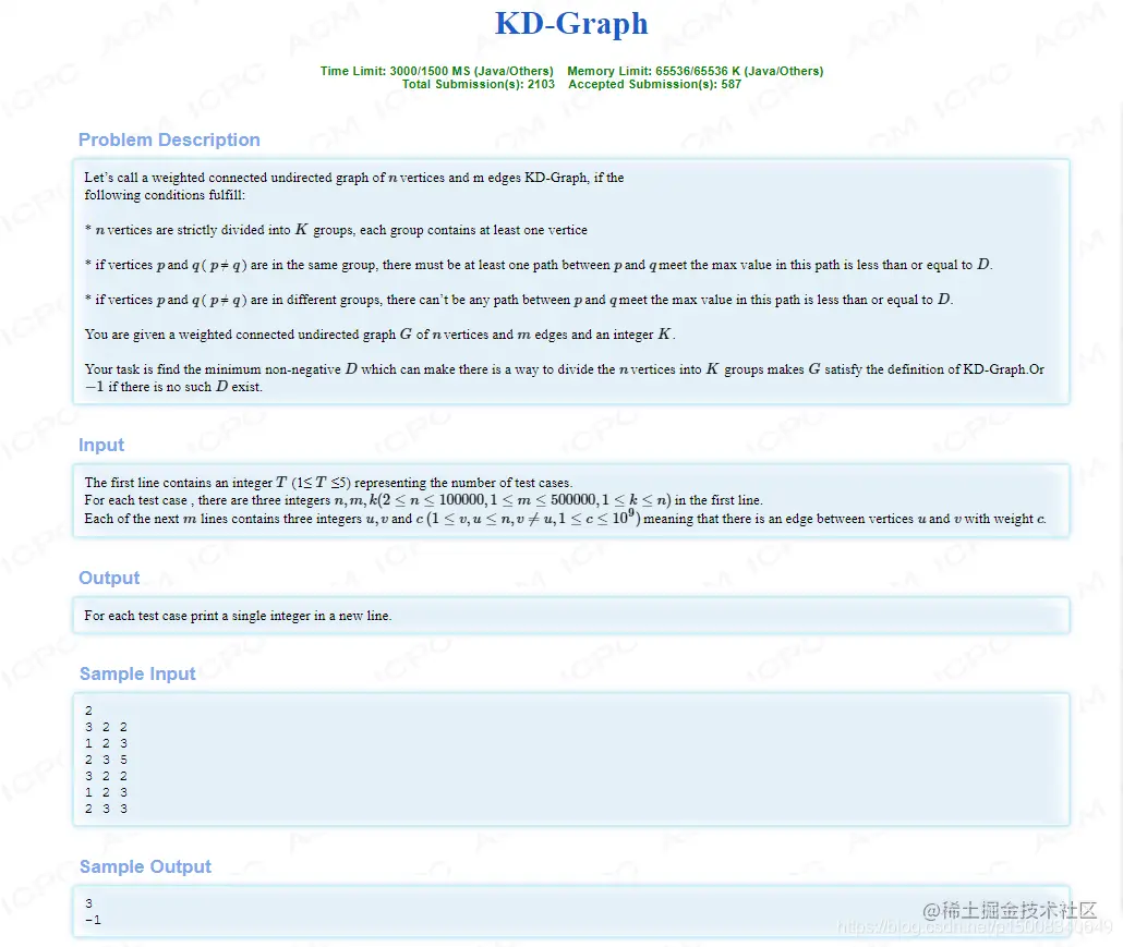 这题和点的关系不大,我们更看重边,因为要保证集合内的边的最大值小于等于某个数,集合与集合之间的边值大于某个数,因而首先一开始可以将每个点都看成一个单独的集合,此时,d的值为所有边的最大值+1,如果此时的集合数大于k,则需要将未合并的最小权值边的端点合并,然后再看合并完后集合数量是否等于k。 综上所述:可以得到一个行之有效的解法:将权值从小到大排列,以到达不同权值的边为分界点,每次判断当前集合的数目是否为k