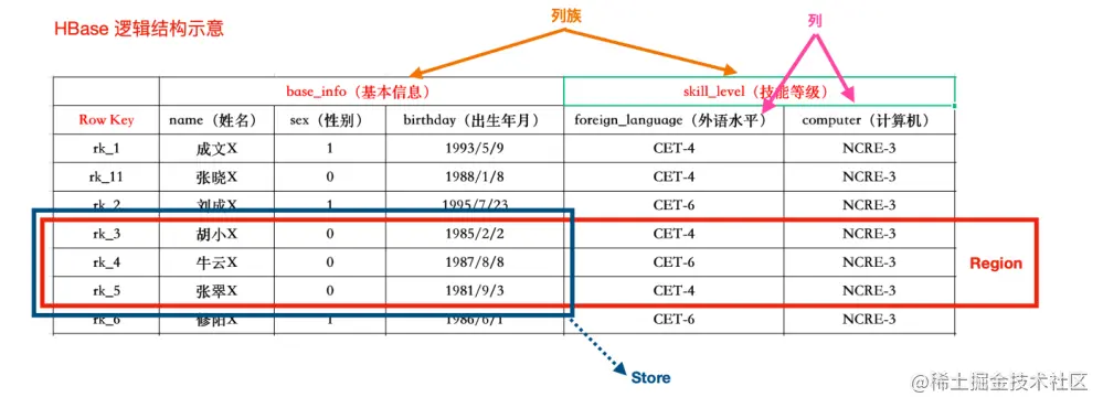 下面通过一个小场景认识HBase存储。同样的一个数据