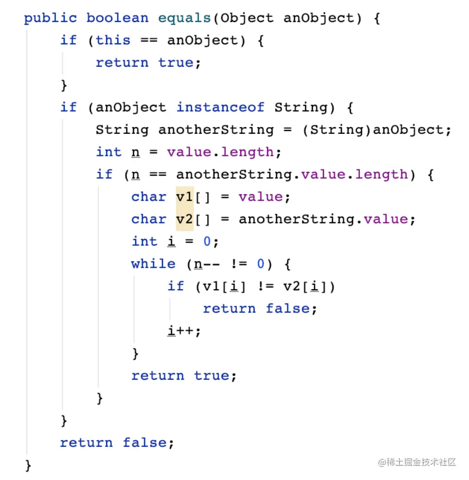 - 首先会判断要比较的两个字符串它们的引用是否相等。如果引用相等的话,直接返回 true ,不相等的话继续下面的判断