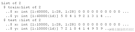 MNIST数据集的数据结构简单明了,有两块。(1) 训练集:x(即特征):60000x28x28张量,对应于60000张28x28像素的图像,采用灰度表示(即每个28x28矩阵中所有的值都是0到255之间的整数),y(即因变量):一个长度为60000的向量,包含相应的数字,整数值在0到9之间。(2) 测试集:与训练集相同,但只有10000个图像和因变量。数据集的详细结构可以通过下面的str(mnist)看到。