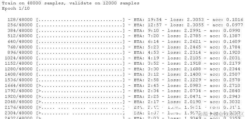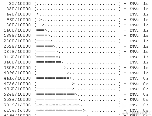 现在,我们可以用我们处理过的数据来训练模型。每个epochs的历史记录都可以被保存下来以追踪进度。请注意,由于我们没有使用GPU,它需要几分钟的时间来完成。在等待结果时,请耐心等待。如果在GPU上运行,训练时间可以大大减少。