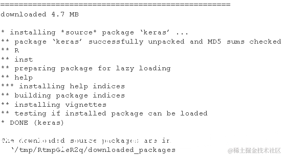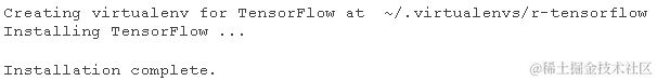 由于keras只是流行的深度学习框架的一个接口,我们必须安装一个特殊的深度学习后端。默认和推荐的后端是TensorFlow。通过调用install_keras(),它将为TensorFlow安装所有需要的依赖项。下面的单元格需要一分钟左右的时间来运行。