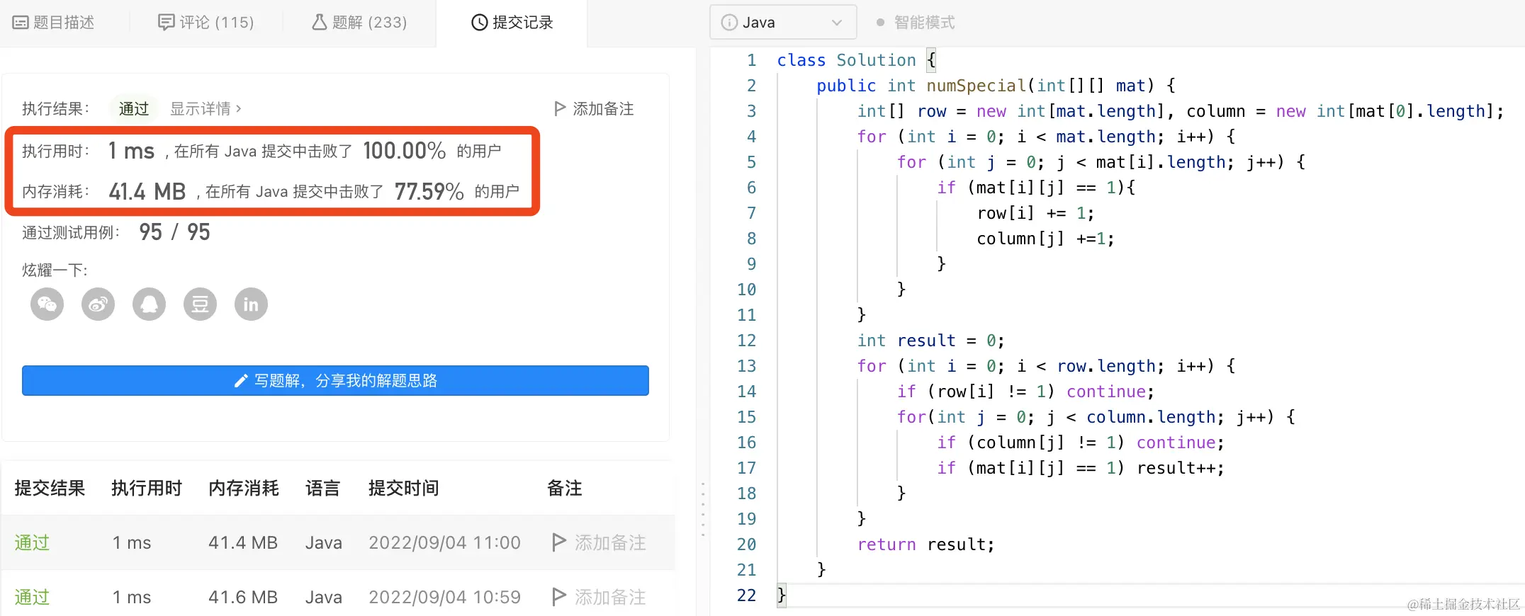 给你一个大小为 rows * cols 的矩阵 mat,其中 mat[i][j] 是 0 或 1,请返回 矩阵 mat 中特殊位置的数目 。