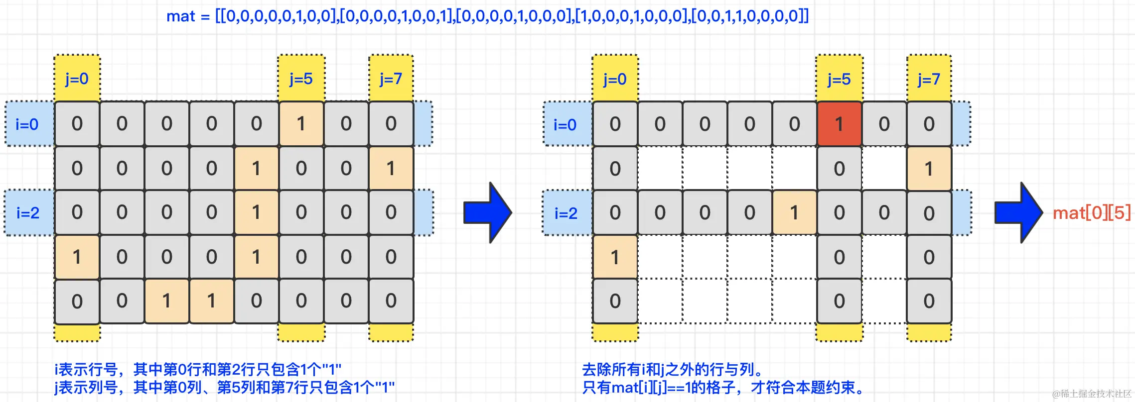 【解释】(1,2) 是一个特殊位置,因为 mat[1][2] == 1 且所处的行和列上所有其他元素都是 0