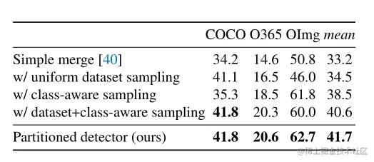 这可以被认为是并行训练K个数据集特定检测器,同时共享它们的主干架构。每个数据集特定架构与公共主干共享除最后一层之外的所有层。每个数据集最后都使用自己的分类层。称之为分区检测器。通过最小化K个数据集的特定损失,在所有数据集上训练分区检测器: