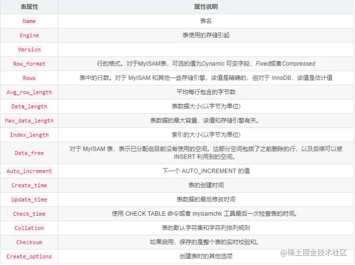 (Name, Engine, Version, Row_format, Rows, Avg_row_length, Data_length, Max_data_length, Index_length, Data_free, Auto_increment, Create_time, Update_time, Check_time, Collation, Checksum, Create_options, Comment)