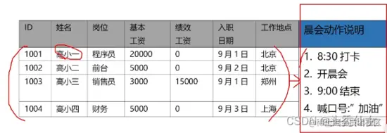 表中一行一行的数据,都在表结构的约束范围内,大家的结构都是相同的。如下表:
