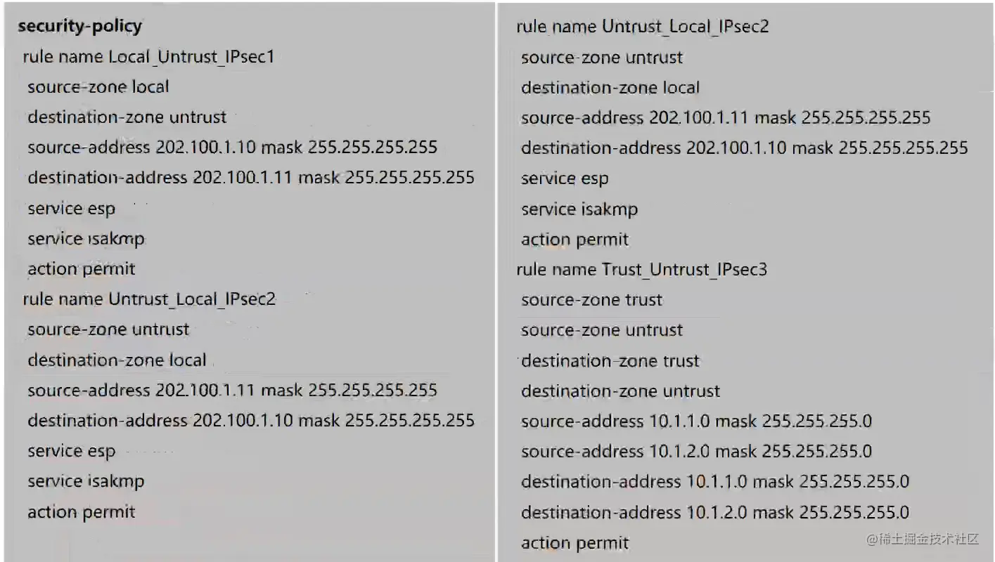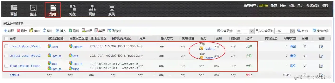 新建安全策略,放行两个防火墙的esp和isakmp流量。