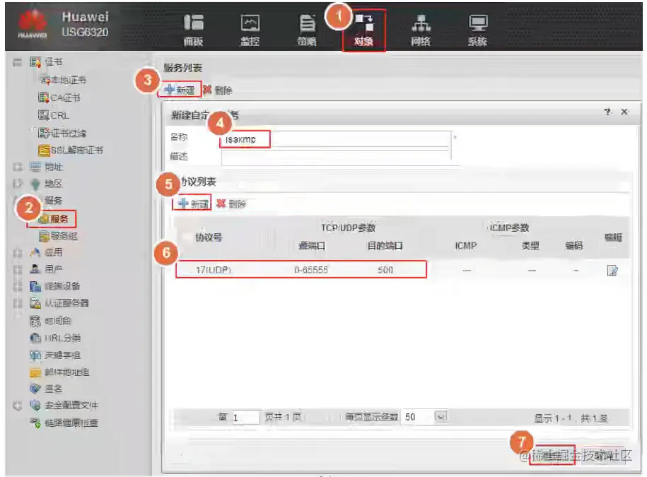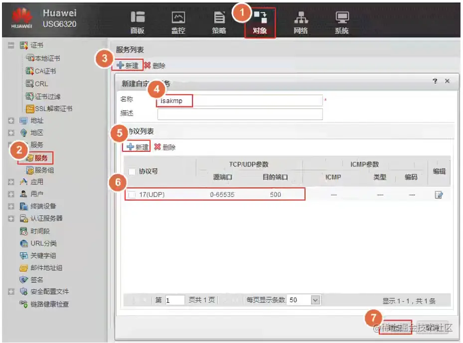 新建服务【isakmp】,UDP协议,目的端口为500。
