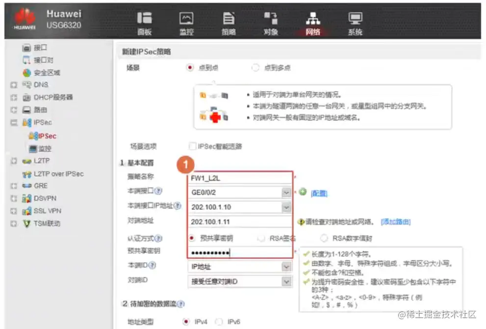 新建IPsec策略,填写IPsec基本配置。