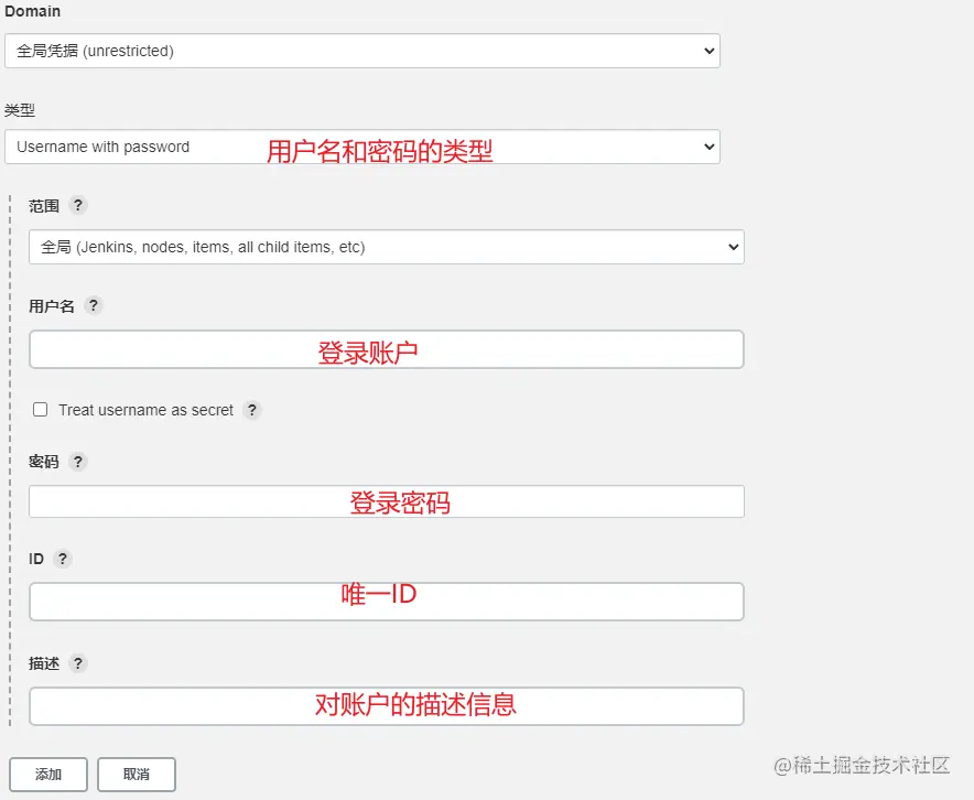默认情况下Credentials的位置是没有选项的,需要点击旁边的添加进行操作,点击会出现如下弹框,然后根据对应的信息输入相关内容即可