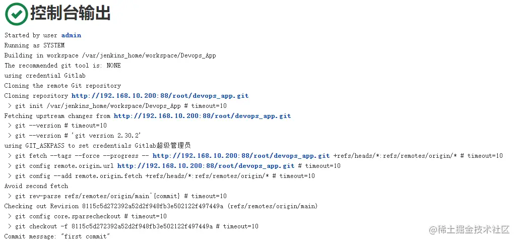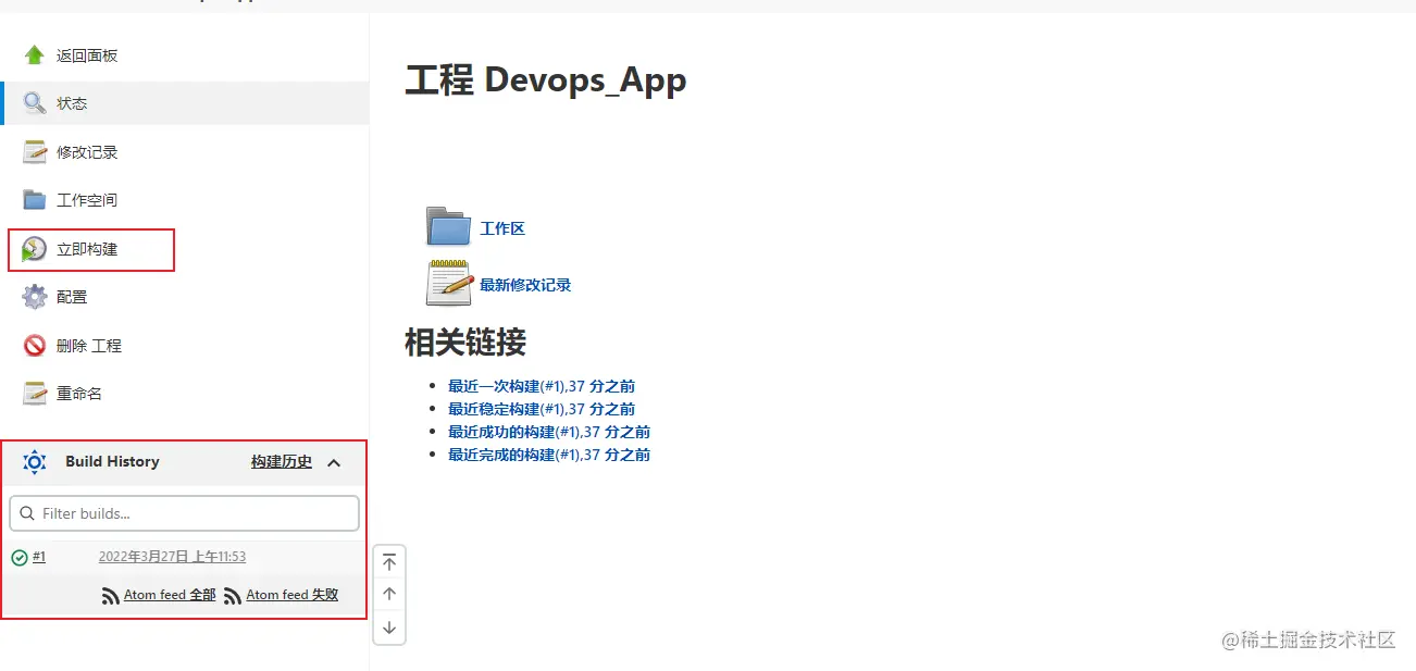 点击菜单中立即构建,会在下方出现每次构建的历史,随后在构建历史中出现构建过程中的进度条,点击进度条会进入到控制台输出页面,这里会实时展示构建的日志,很是智能