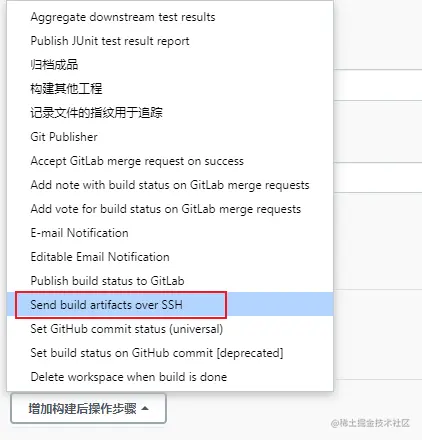 我们继续回到任务的配置页面,选择构建后操作,从中选中Send build artifacts over SSH,配置要推送过去的文件立即构建就能看到效果
