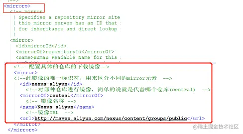 在conf/setting.xml文件中配置,找到mirrors位置如图: