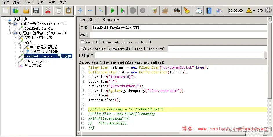 c.把关联获取到的值写入文件,因为被压测的接口需要用到tokenId和卡号cardNumber,所以需要把tokenId和卡号配对写在一行上,第一列是tokenId,第二列是卡号cardNumber