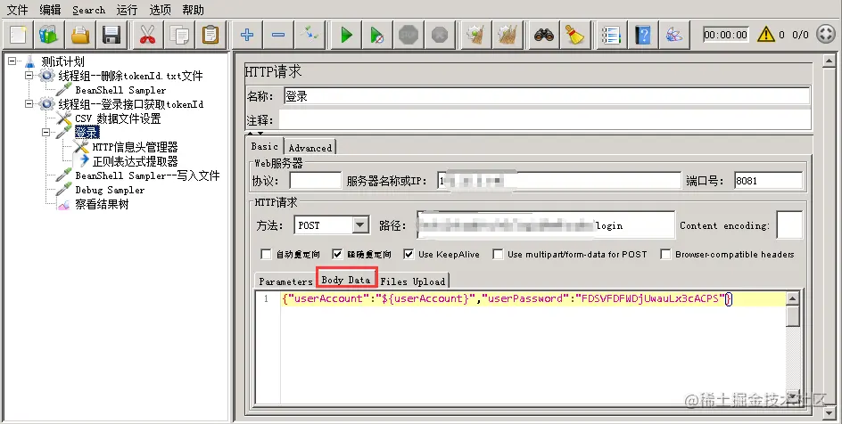 3.在http请求中,将固定的ip地址和端口号改成刚刚添加的变量名: