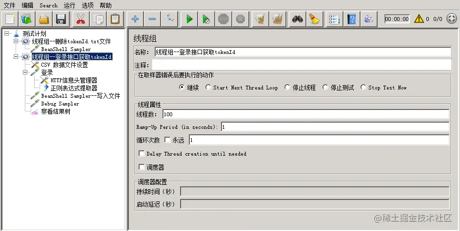因为只有100个账号,所以线程数设置为100,循环次数设置为1,即每个线程运行一次