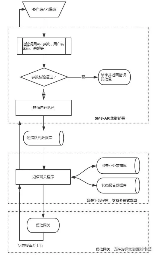 1.所有业务系统调用接口、所有校验:账户合法性、号码合法性、内容合法性、发送时段等配置全在内存进行,没有进行任务DB操作 2.校验完毕后,进行计费,在这里如果要求控制配额需要进行一次DB操作,若不需要则不需要操作DB 3.计费完毕后直接把群发或单发的短信直接放入内存组件,然后直接返回客户端本次提交短信结果,响应毫秒级 4.API使用单独的线程从内存队列取数据批量入库,异步处理