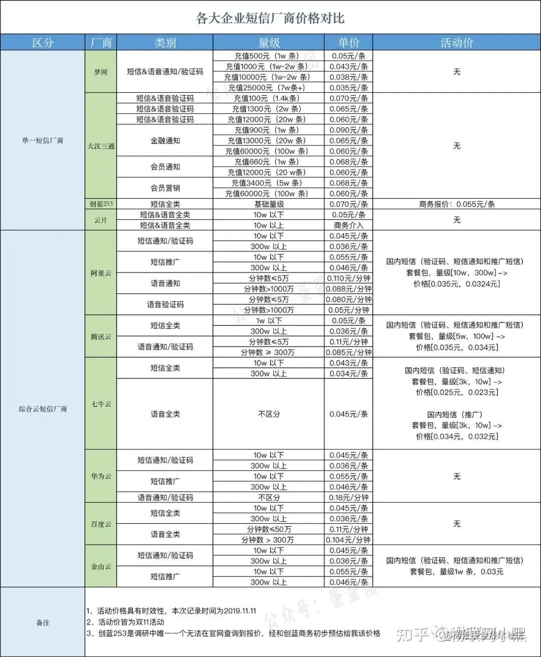 第一类主要是梦网、大汉三通、创蓝253和云片等单一短信场景厂商,第二类是阿里云、腾讯云、七牛云、华为云、百度云和金山云等综合公有云厂商。