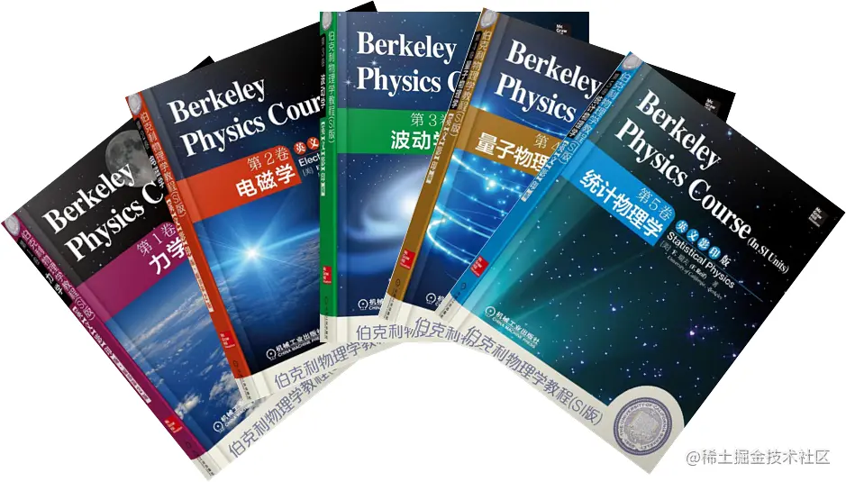 接下来是普通物理方面的教材。北京大学的赵凯华写过一套很好的普通物理教材:《新概念物理教程》,整套教材包括《力学》、《热学》、《电磁学》、《光学》和《量子物理》,共五卷,是学习物理学的一本很好的参考教材。此外,20世纪60年代出版的《费曼物理学讲义》以及80年代出版的《伯克利物理学教程》,都是学习物理学的很好的参考资料。