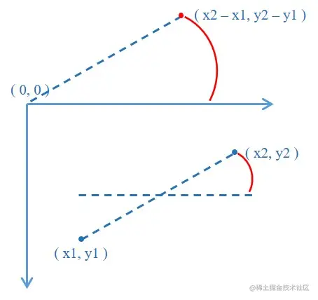 将连接线平移,使其原 (x1, y1) 点与远点 (0, 0) 重合,则原 (x2, y2) 点移动至 (x2 -x1, y2 -y1) ,套用 Math.atan2(y, x) 即可计算出连接线的旋转弧度: