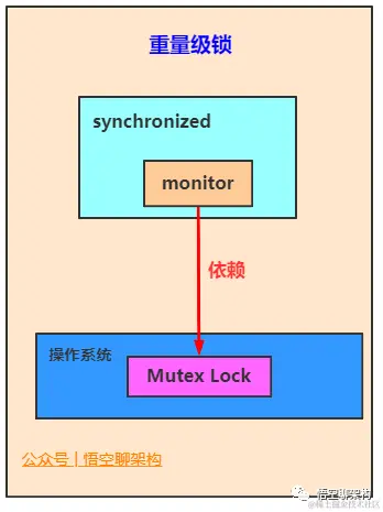 重量级锁是一种称谓: synchronized是通过对象内部的一个叫做监视器锁(monitor)来实现的,监视器锁本身依赖底层的操作系统的 Mutex Lock来实现。操作系统实现线程的切换需要从用户态切换到核心态,成本非常高。这种依赖于操作系统 Mutex Lock来实现的锁称为重量级锁。为了优化synchonized,引入了轻量级锁,偏向锁。