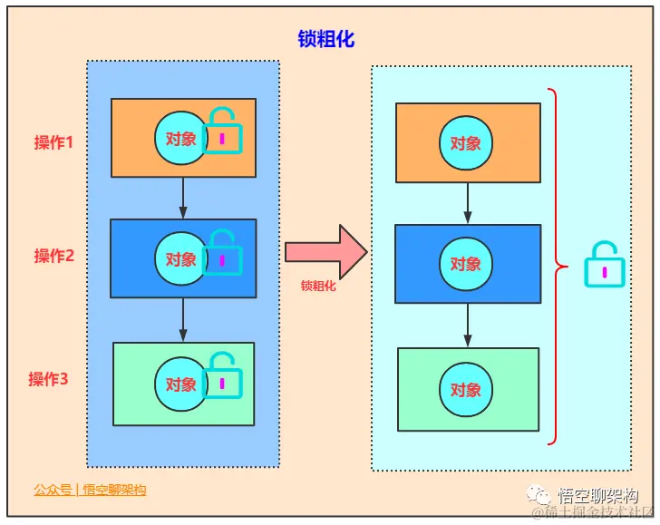 锁粗化是一种优化技术: 如果一系列的连续操作都对同一个对象反复加锁和解锁,甚至加锁操作都是出现在循环体体之中,就算真的没有线程竞争,频繁地进行互斥同步操作将会导致不必要的性能损耗,所以就采取了一种方案:把加锁的范围扩展(粗化)到整个操作序列的外部,这样加锁解锁的频率就会大大降低,从而减少了性能损耗。