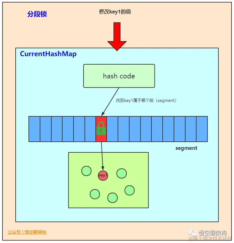 分段锁是一种机制: 最好的例子来说明分段锁是ConcurrentHashMap。ConcurrentHashMap原理: 它内部细分了若干个小的 HashMap,称之为段(Segment)。默认情况下一个 ConcurrentHashMap 被进一步细分为 16 个段,既就是锁的并发度。如果需要在 ConcurrentHashMap 添加一项key-value,并不是将整个 HashMap 加锁,而是首先根据 hashcode 得到该key-value应该存放在哪个段中,然后对该段加锁,并完成 put 操作。在多线程环境中,如果多个线程同时进行put操作,只要被加入的key-value不存放在同一个段中,则线程间可以做到真正的并行。