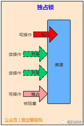 如上图所示,只能有一个线程进行读操作或者写操作,其他线程的读写操作均不能进行。