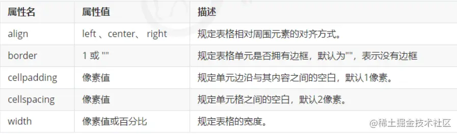 表格标签这部分属性我们实际开发我们不常用,后面通过 CSS 来设置。