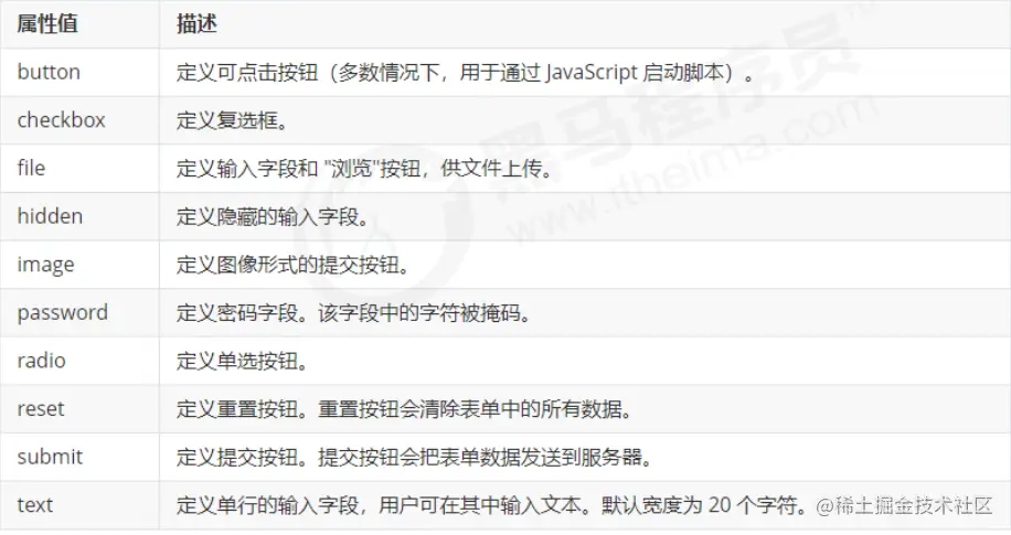 <input>标签用于收集用户信息。在<input>标签中,包含一个 type 属性,根据不同的 type 属性值,输入字段拥有很多种形式(可以是文本字段、复选框、掩码后的文本控件、单选按钮、按钮等)。<input type="属性值" />注:<input />标签为单标签- type 属性设置不同的属性值用来指定不同的控件类型