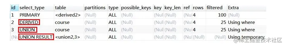 对于关联查询,先执行右边的 table(UNION),再执行左边的 table,类型是DERIVED