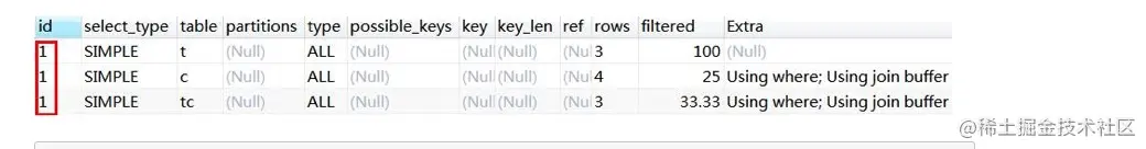 从上往下顺序执行。例如这次查询的 id 都是 1,查询的顺序是 teacher t(3 条)——course c(4 条)——teacher_contact tc(3 条)。
