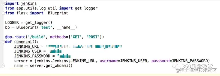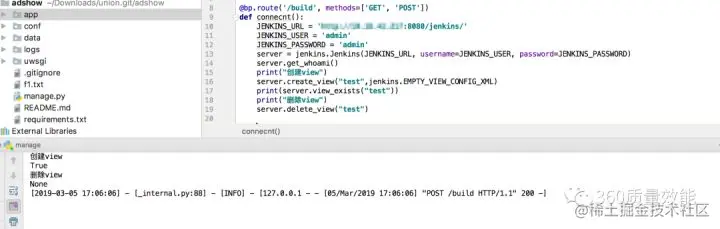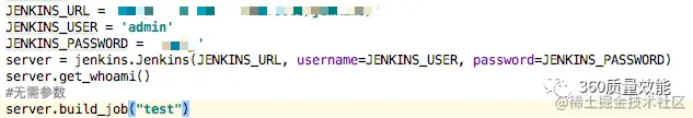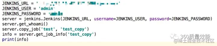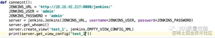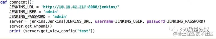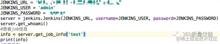 可直接import Jenkins模块,定义访问url、账户、密码,使用jenkins.Jenkins连接jenkins,示例如下: