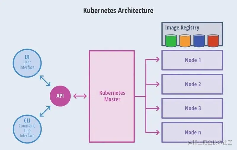 总结 实际上除了上面讲的能力外,K8S 还包含了非常多的容器编排能力,尤其对于在线服务的编排能力上尤为强大, 但这部分内容留待后续讲解。最后附上一个最简单的 K8S 流程图帮助大家理解。毕竟 K8S 还是一个集群管理软件,上述说明的所有案例在提交给 K8S 后, K8S 都会按照自己的调度策略将 POD 调度到一个合适的节点上执行。