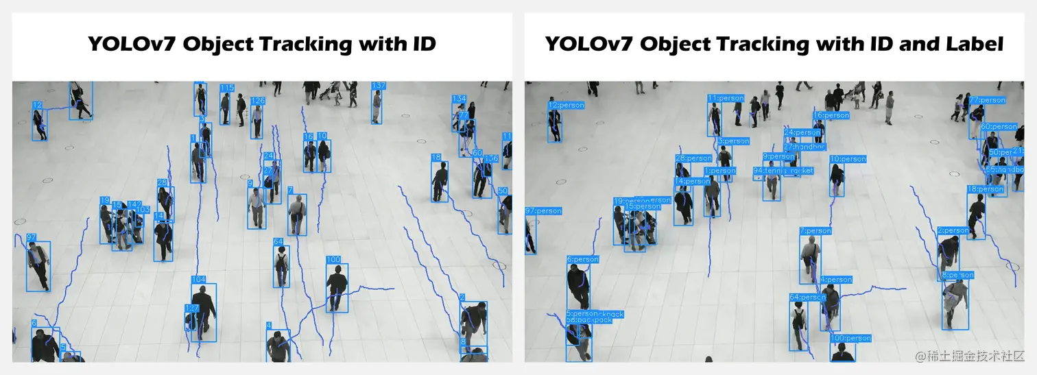 基于PyTorch、OpenCV 和 Sort Tracking 实现的 YOLOv7 物体跟踪,支持为每条轨迹添加标签。代码可以同时运行在 CPU 和 GPU 上,支持视频/网络摄像机/外部摄像机/IP流等输入源。