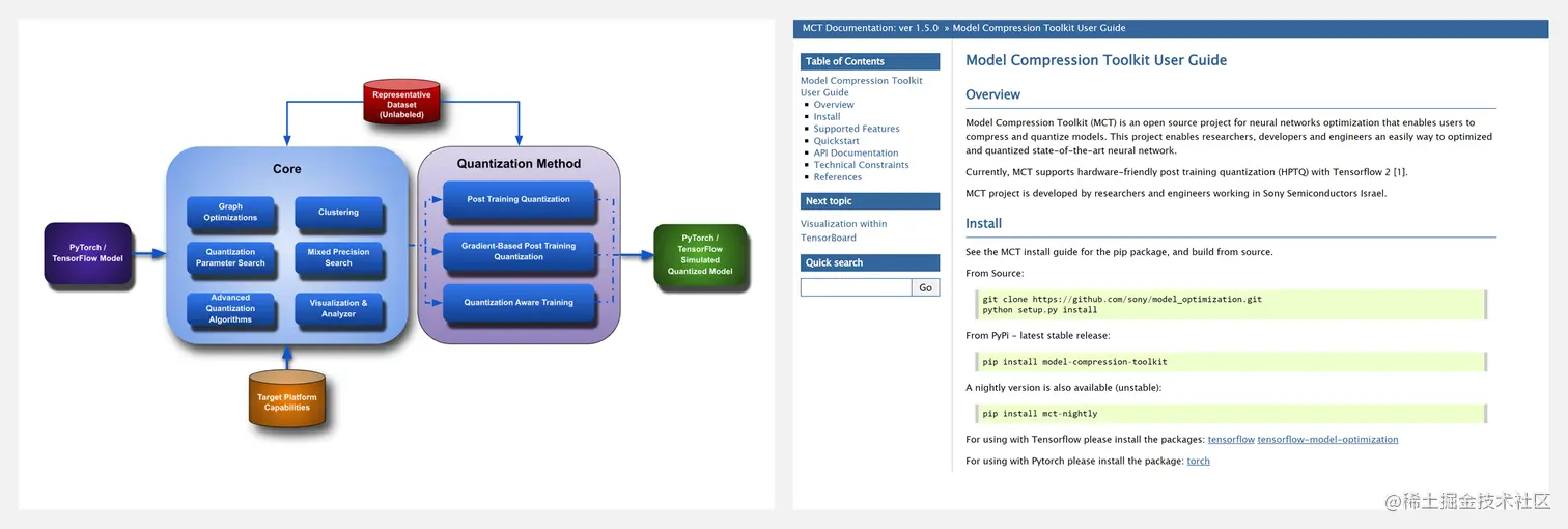 Model Compression Toolkit(MCT)是一个开源工具,用于高效、硬件资源有限下的神经网络模型优化。该工具为研究人员、开发人员和工程师提供先进的量化和压缩工具,用于部署最先进的神经网络。