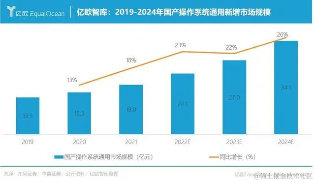 目前我国操作系统整体国产化率不足5%,从“2+8+N”的体系来看,党政体系操作系统国产化率高于行业体系,在行业中金融行业和电信行业国产化率逐步提升。根据亿欧智库测算,国产操作系统通用市场增速将超过20%。