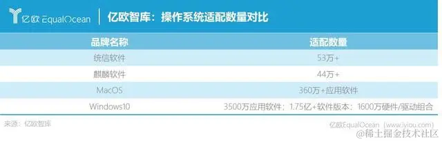虽然统信软件在今年7月宣布生态适配数量突破50万,成为国内首个突破50万生态适配的操作系统厂商。(截至7月25日,统信软件软硬件兼容适配认证数共计529903款),但与海外的MacOS和Windows操作系统相比,仍然存在数量级上的差距。