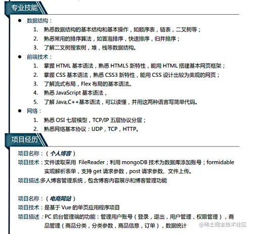 而且大部分投递前端职位同学的专业能力描述基本上一样的,没有区分度,不需要放到重点的位置。