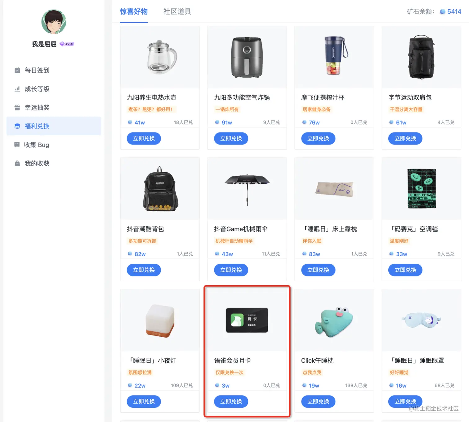 另外,语雀还在掘金的福利兑换商城上架了语雀会员,只要在掘金上经常学习、分享、参与活动,就可以免费获得「矿石」,兑换语雀会员服务。