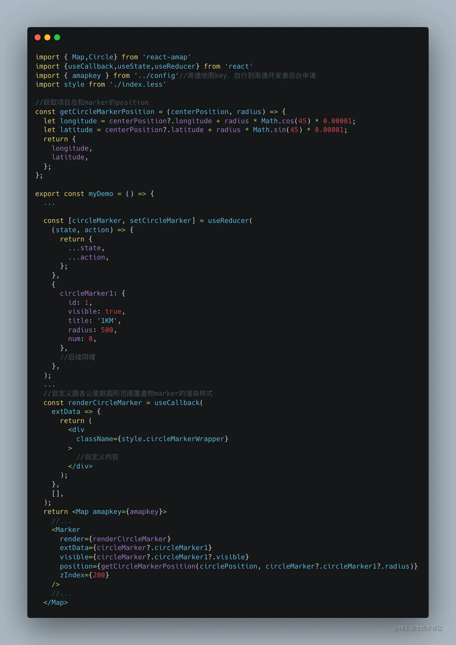 本例主要使用React+React-Amap(基于React封装的高德地图组件)来实现,react-amap帮我们封装好了一些marker和覆盖物组件,使用起来相当方便,当然你也可以阅读学习后根据你当前的技术栈来进行改造