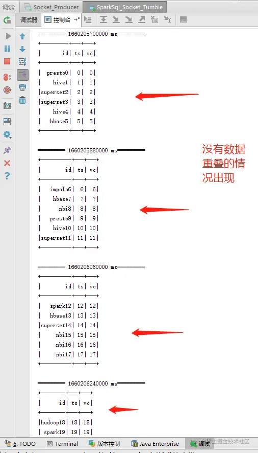 代码中定义了一个3分钟的时间窗口和3分钟的滑动大小,运行结果可以看出数据没有出现重叠,实现了滚动窗口的效果:
