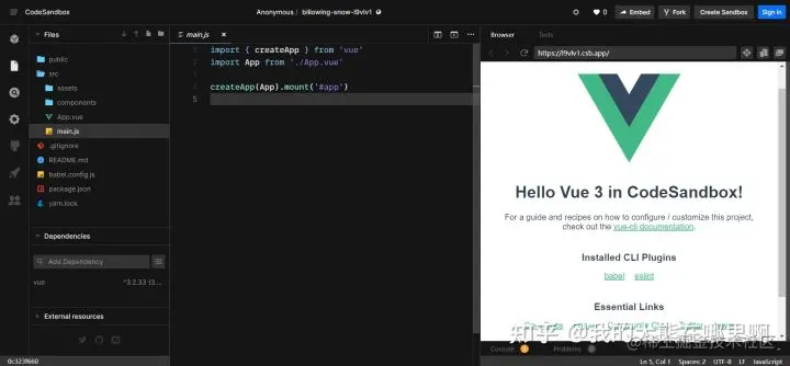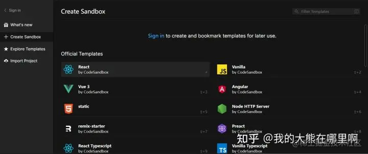 1.进入沙盒官网codesandbox.io/,点击右上角按钮Create Sandbox(不用登录)