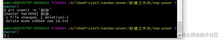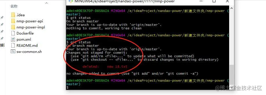 2、这里手动删除 new 18.txt 文件,然后 执行 git status