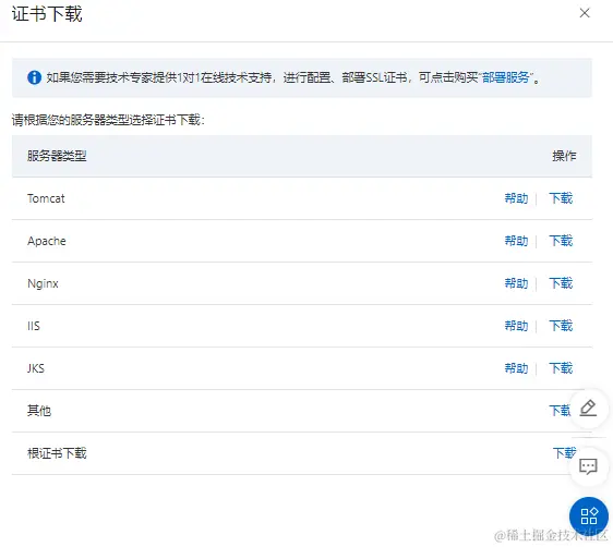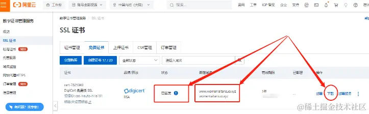 首先,我们需要回到域名平台的SSL证书页面,在这里我们能看到对应域名的安全证书已经签发,并出现了“下载”项。
