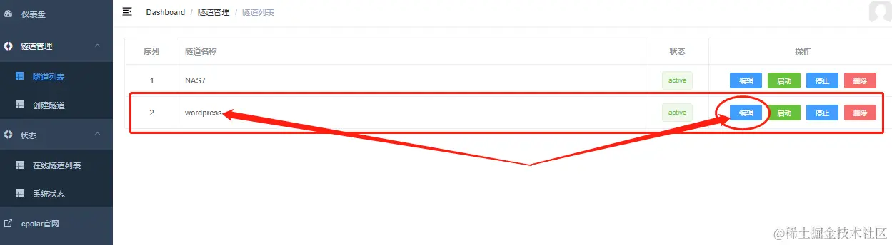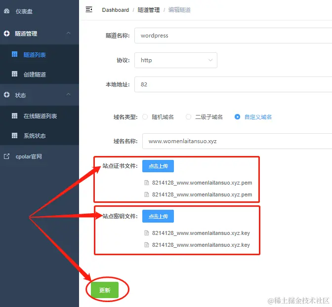 接着,我们打开cpolar的客户端,在“隧道管理”项下的“隧道列表”页面,选择群晖的网页隧道点击“编辑”按钮,将网站的安全证书配置到cpolar客户端里。需要注意的是,网站安全证书有两个文件,分别为证书的公钥文件和私钥文件,站点证书文件后缀名为.pem;站点密钥文件后缀名为.key,在上传文件时不能将这两个文件搞混。