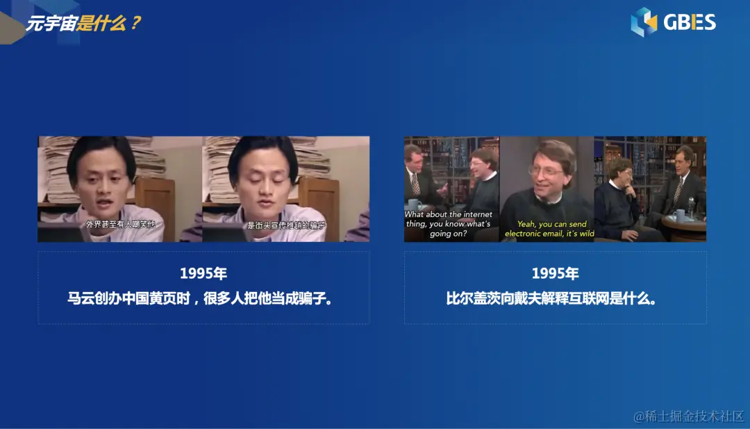 最后再回到元宇宙是什么?我们把两位互联网的领导者在1995年发生的故事分享给大家。1995年,马云创办中国黄页时,很多人把他当成骗子。无独有偶,当年比尔盖茨也很难向戴夫解释清楚互联网是什么。就如同当年的马云和比尔盖茨,今天或许我们也没有人能够具体说明白元宇宙到底能做什么,但毋庸置疑元宇宙的价值一定会远远超出我们目前认知范围内的想象。