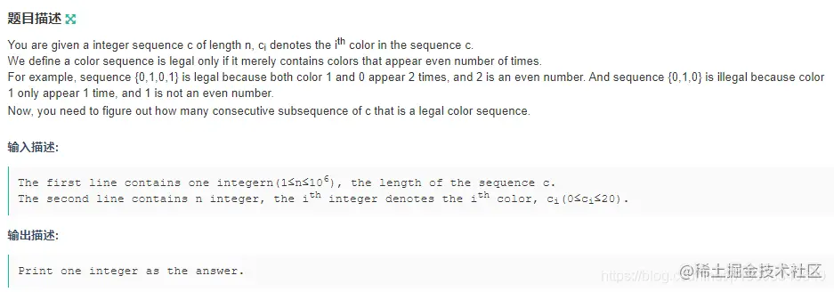 因为是求出现次数为偶数的子段,且颜色最多只有20种,因此可以用二进制中对应1左移的位数来表示该数出现的次数是偶数次还是奇数次,可以考虑用异或前缀和来实施此方案。接着从前往后维护偶数次颜色出现的次数,以后的每一个偶数次颜色都能以之前出现过的偶数次颜色作为起点构成新的一组合法子序列。
